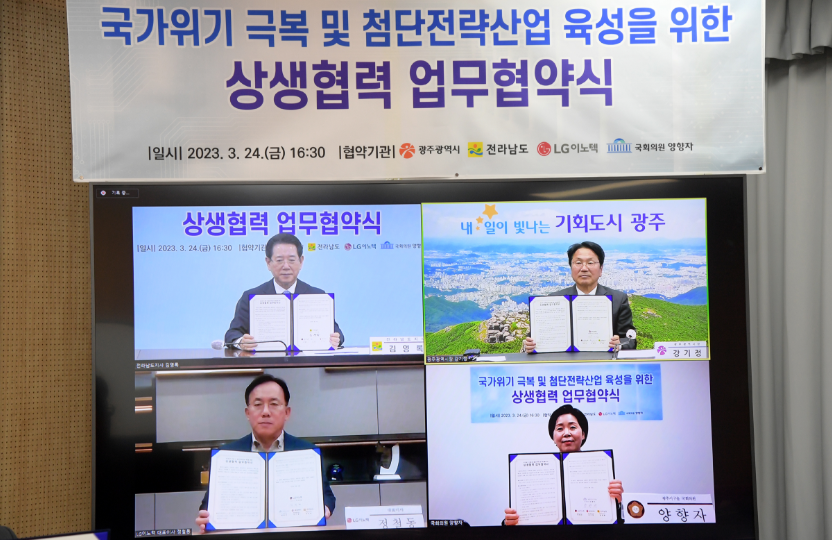 ±¤ÁÖ½Ã¿Í Àü³²µµ¿¡ µû¸£¸é 24ÀÏ °±âÁ¤ ½ÃÀå, ±è¿µ·Ï Áö»ç, ¾çÇâÀÚ ±¹È¸ÀÇ¿ø, Á¤Ã¶µ¿ LGÀ̳ëÅØ¢ß ´ëÇ¥À̻簡 Âü¼®ÇÑ °¡¿îµ¥ ¡®±¹°¡À§±â ±Øº¹ ¹× ÷´ÜÀü·«»ê¾÷ À°¼ºÀ» À§ÇÑ »ó»ýÇù·Â ¾÷¹«Çù¾à¡¯À» ü°áÇß´Ù.